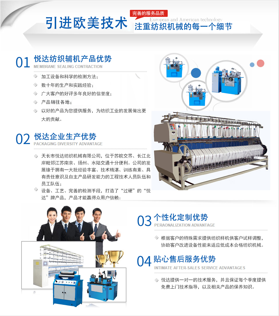 天長市悅達紡織機械有限公司座落在皖東天長市仁和集鎮(zhèn)人民西路88號,公司位于蘇皖交界、長江北岸毗鄰江蘇南京、揚州、水陸交通十分便利。 公司是主要生產紡織平車安裝工具、紡部輔件及配件綜合性企業(yè)。已有二十多年的生產歷史,在激烈的市場競爭中始終保持優(yōu)良的質量、優(yōu)化的價格、齊全的品種優(yōu)勢。產品暢銷全國各地,深受新老客戶的好評。 公司以服務客戶滿足用戶為己任,不斷提高產品加工精度,拓展系列品種,以高標準、高起點滿足客戶需求。公司精神:創(chuàng)新、開拓、務實。公司宗旨:追求誠信、追求質量、追求服務、為用戶著想。